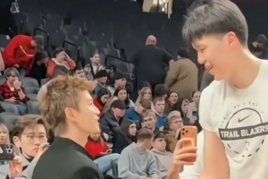 體育資訊2月8日訊 今日上午開(kāi)拓者主場(chǎng)背靠背再戰(zhàn)灰熊,賽前演員任嘉倫來(lái)到場(chǎng)邊給楊瀚森加油,與其握手聊天。