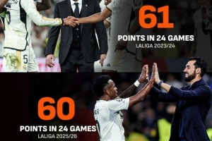 本賽季,皇馬在西甲24輪后拿到了60分,創(chuàng)造隊(duì)史第三高的24輪后積分。