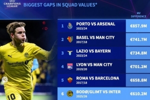 體育資訊2月25日訊 國(guó)米在本輪歐冠主場(chǎng)1-2不敵博德閃耀,兩回合總比分2-5被雙殺,德轉(zhuǎn)數(shù)據(jù)統(tǒng)計(jì)顯示,兩隊(duì)身價(jià)相差6.1億歐元,這也是歐冠以弱勝?gòu)?qiáng)的第6大身價(jià)差。