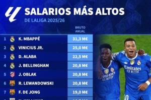 體育資訊1月24日訊 德國(guó)轉(zhuǎn)會(huì)市場(chǎng)盤(pán)點(diǎn)了本賽季西甲球員年薪情況,姆巴佩以3130萬(wàn)歐元居首,維尼修斯以2500萬(wàn)歐元位居次席,前四均為皇馬球員。